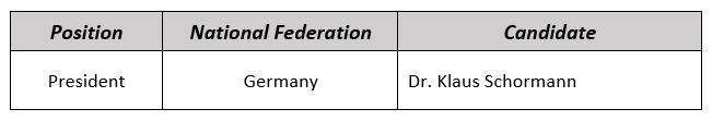 According to Articles 5.4 and 5.5 of UIPM Election Rules, the following candidate nominated by his National Federation and checked by the UIPM Electoral Committee is eligible for the elections to be held during the UIPM 2021 Congress: