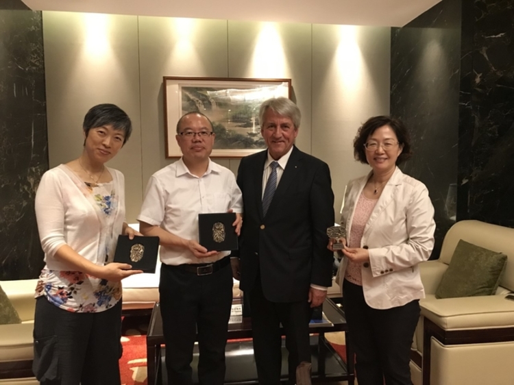 Dr Schormann and Mrs Fang with the organising team (above) and (right) with University President Wang Qinghua and Liu Zhihui of the Party Committee