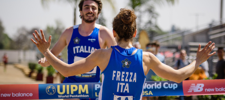 Alessandra Frezza and Riccardo de Luca repeated the success enjoyed by Gloria Tocchi and Gianluca Micozzi at Pentathlon World Cup Cairo as Italy held off a strong challenge from USA and Mexico to secure victory on a hot day in Pomona, Los Angeles County.