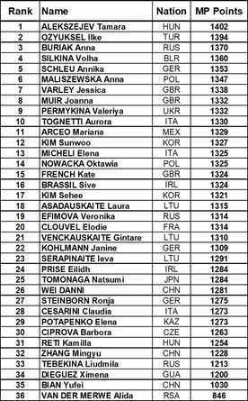 Before that, Clouvel (FRA) and Asadauskaite (LTU) had fallen out of contention after their rides, incurring 49 and 85 penalty points respectively.