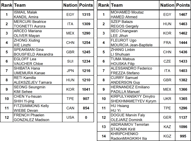 Egypt (Ismail/Kandil) duly laid down a marker in Fencing by racking up 28 victories in the Ranking Round and tacking on four more points in the Fencing Bonus Round. That was enough to give them an early three-point lead over Mexico (Oliver/Arceo) with the talented duo of Seungmin Seong and Sehee Kim (KOR) a point further back.