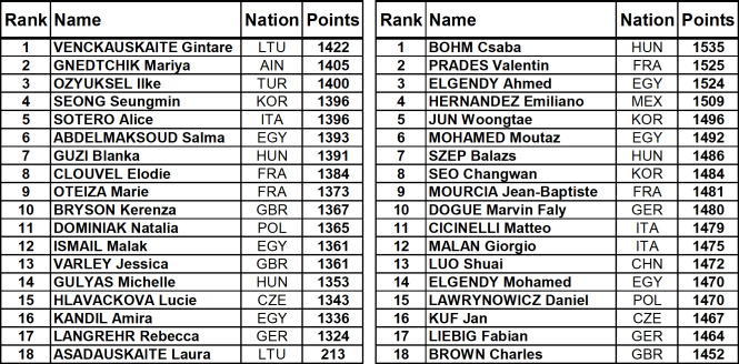 Ahmed Elgendy (EGY) top-scored with 308 points as he went two-tenths of a second faster than Mohamed (EGY), but there was little to split them from Matteo Cicinelli (ITA), Giorgio Malan (ITA), Jun (KOR) and Bohm (HUN).