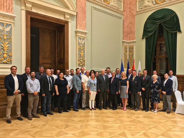 Left to right: ECMP Vice-President Andrey Kuzmanov, City Mayor Dr András Cser-Palkovics, UIPM President Dr Klaus Schormann, ECMP Secretary General Tatiana Ardabieva, ECMP Vice-President Andris Feldmanis and Vice Mayor Attila Mészáros