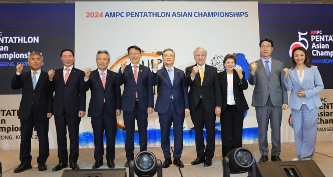 As part of the festivities, President Dr Schormann joined President Lee, former AMPC President Hyunjun Kim and his successor Hanjoon Lee, Monsung Lee from the Sport Council and the Mayor of Hwaseong, Myeonggeung Jeong, in cutting a cake to celebrate the good cooperation between AMPC & UIPM and the successful Asian Championships.