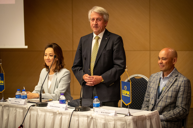 On the eve of the Finals, on June 10, President Dr Schormann was joined by Secretary General Shiny Fang and two members of the UIPM Athletes Committee, Yasser Hefny OLY (Chair) and James Cooke OLY, on the panel for an Open Athletes Meeting.